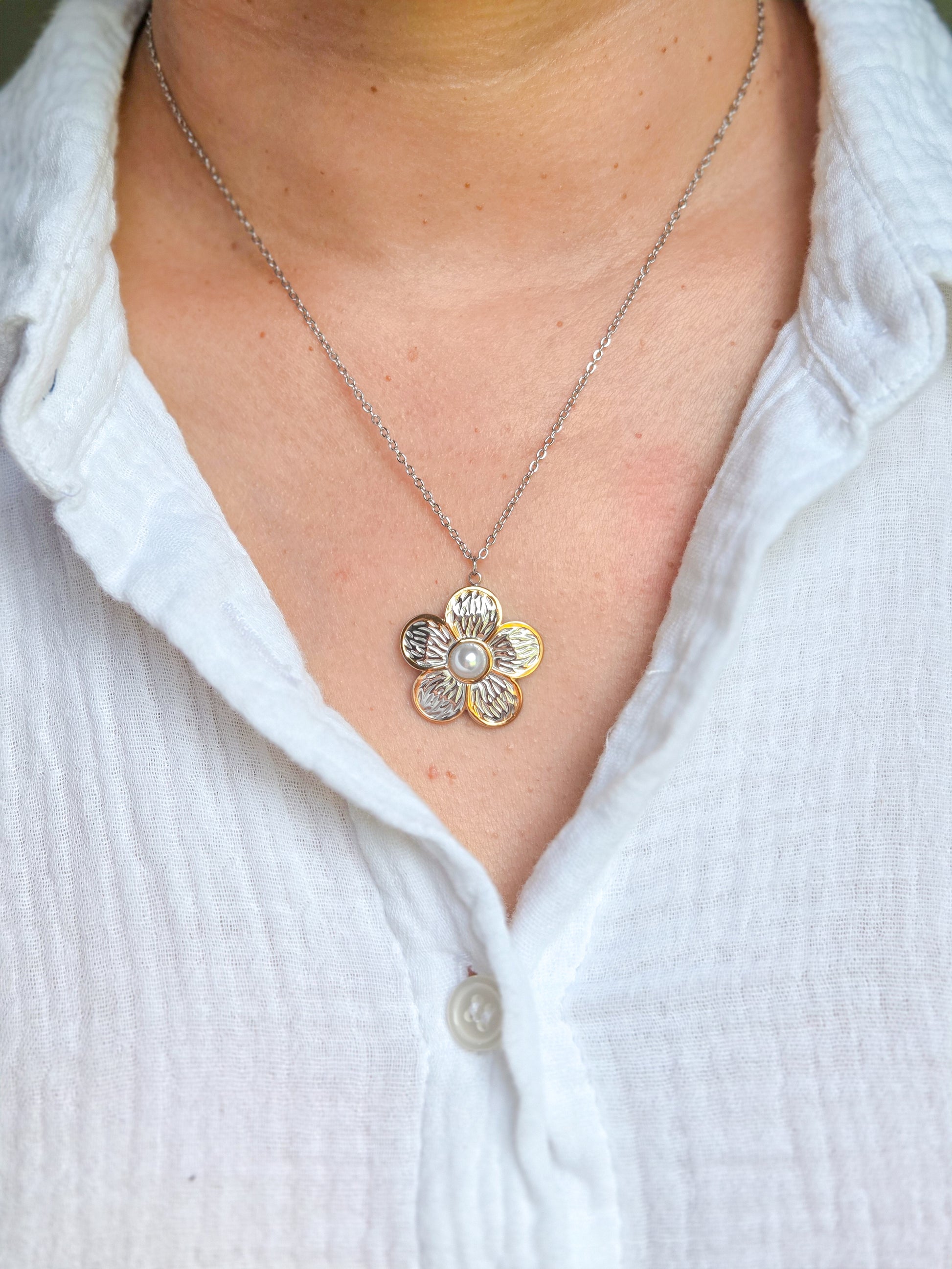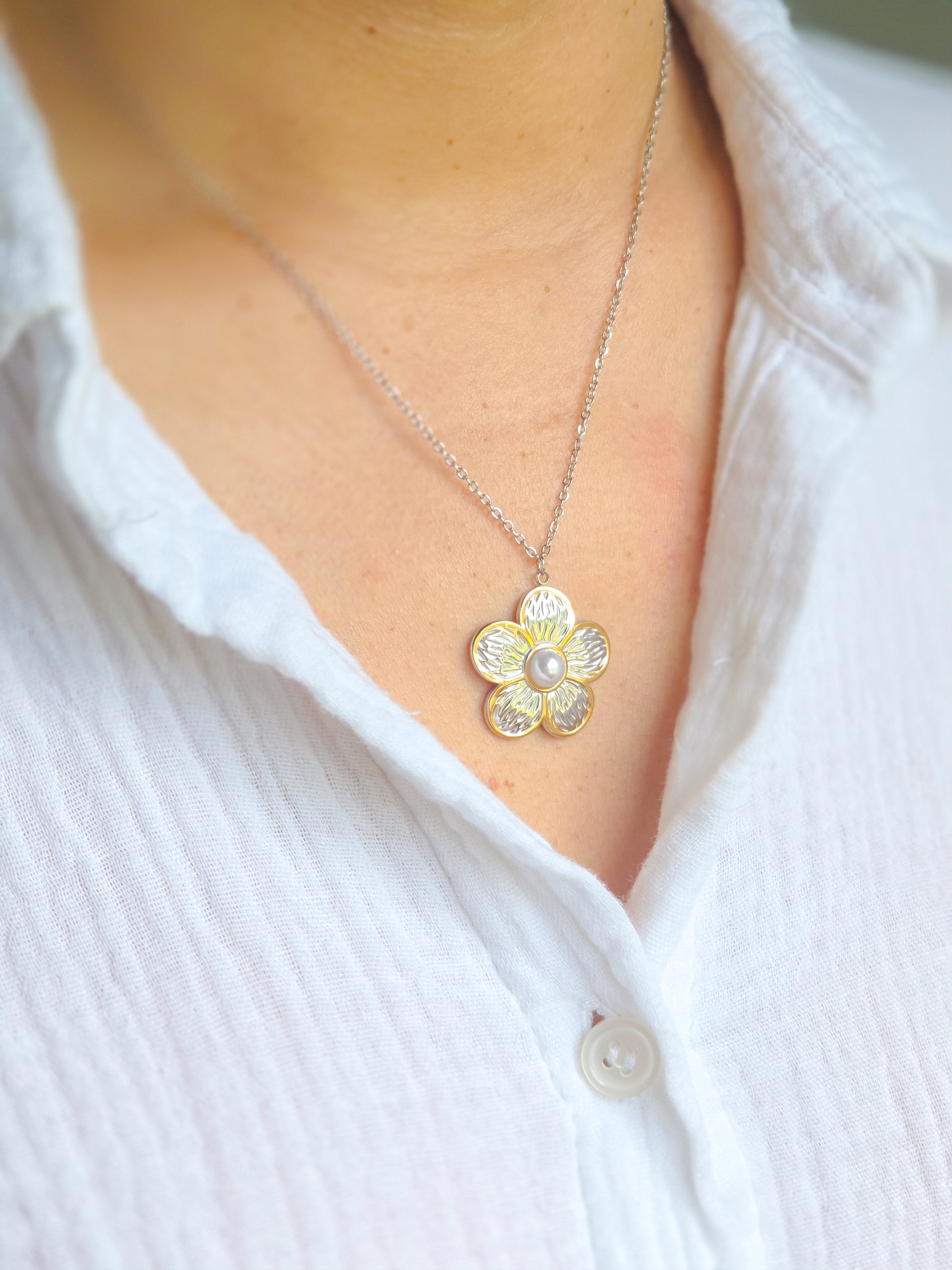 - Delicada cadena de flor con centro en perlita