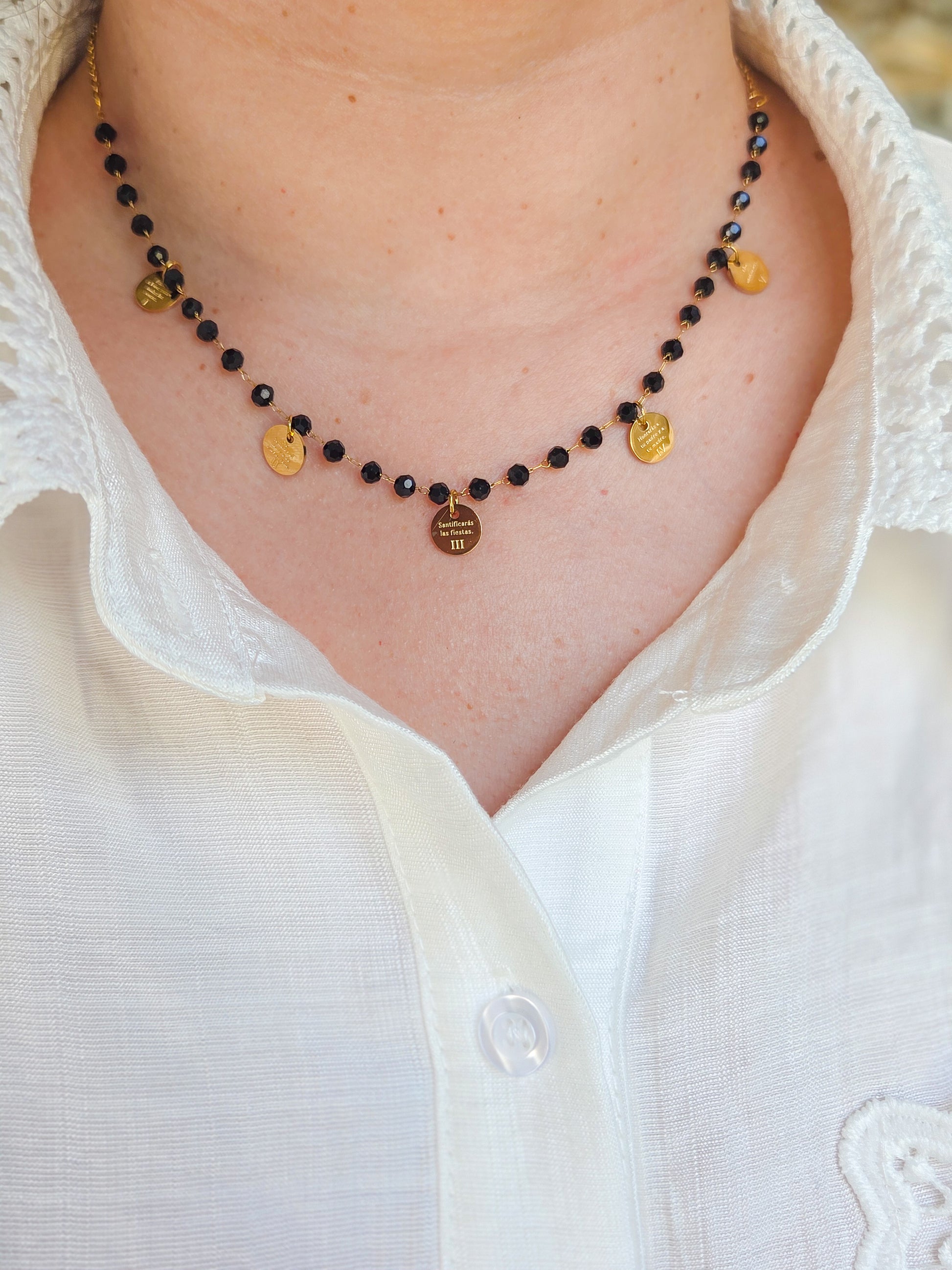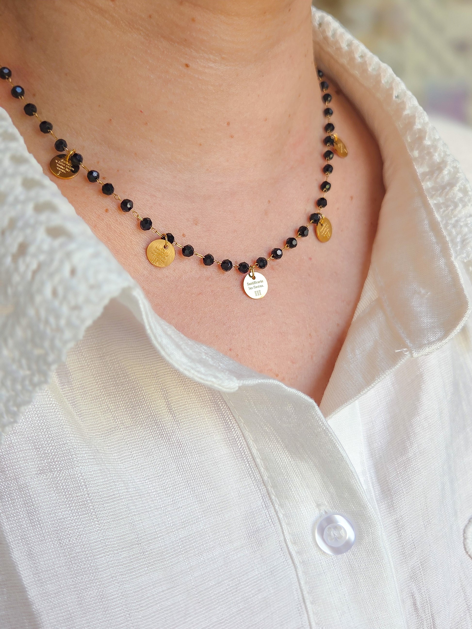 - Delicada cadena con toques en color negro y charms con los 10 mandamientos
