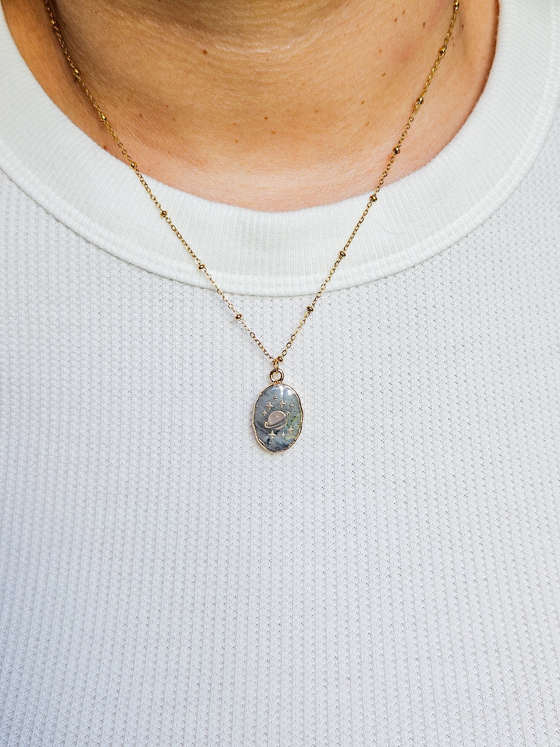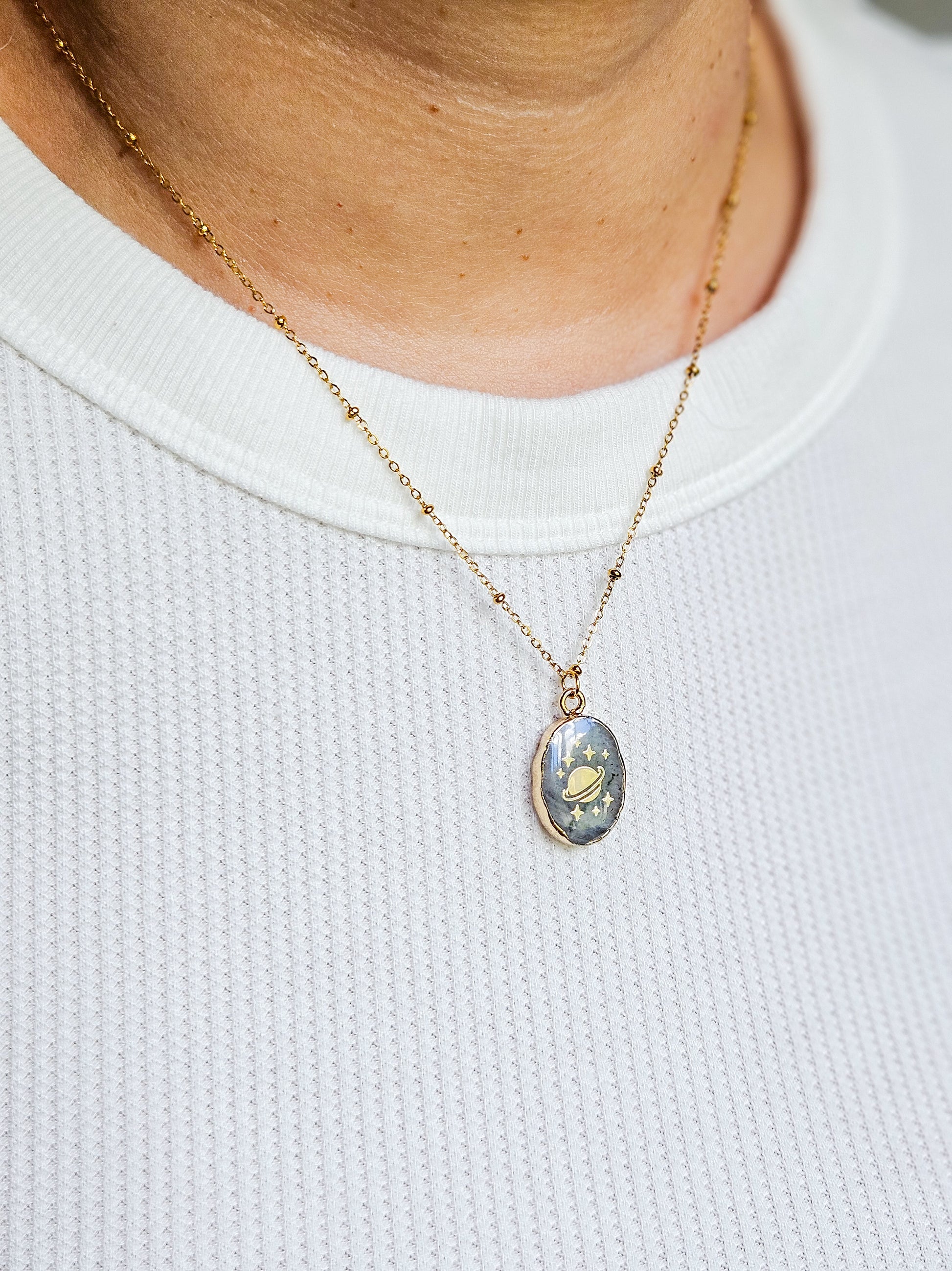 - Cadena en stainless steel con charm en un tono azul/gris con un planeta y pequeñas estrellitas