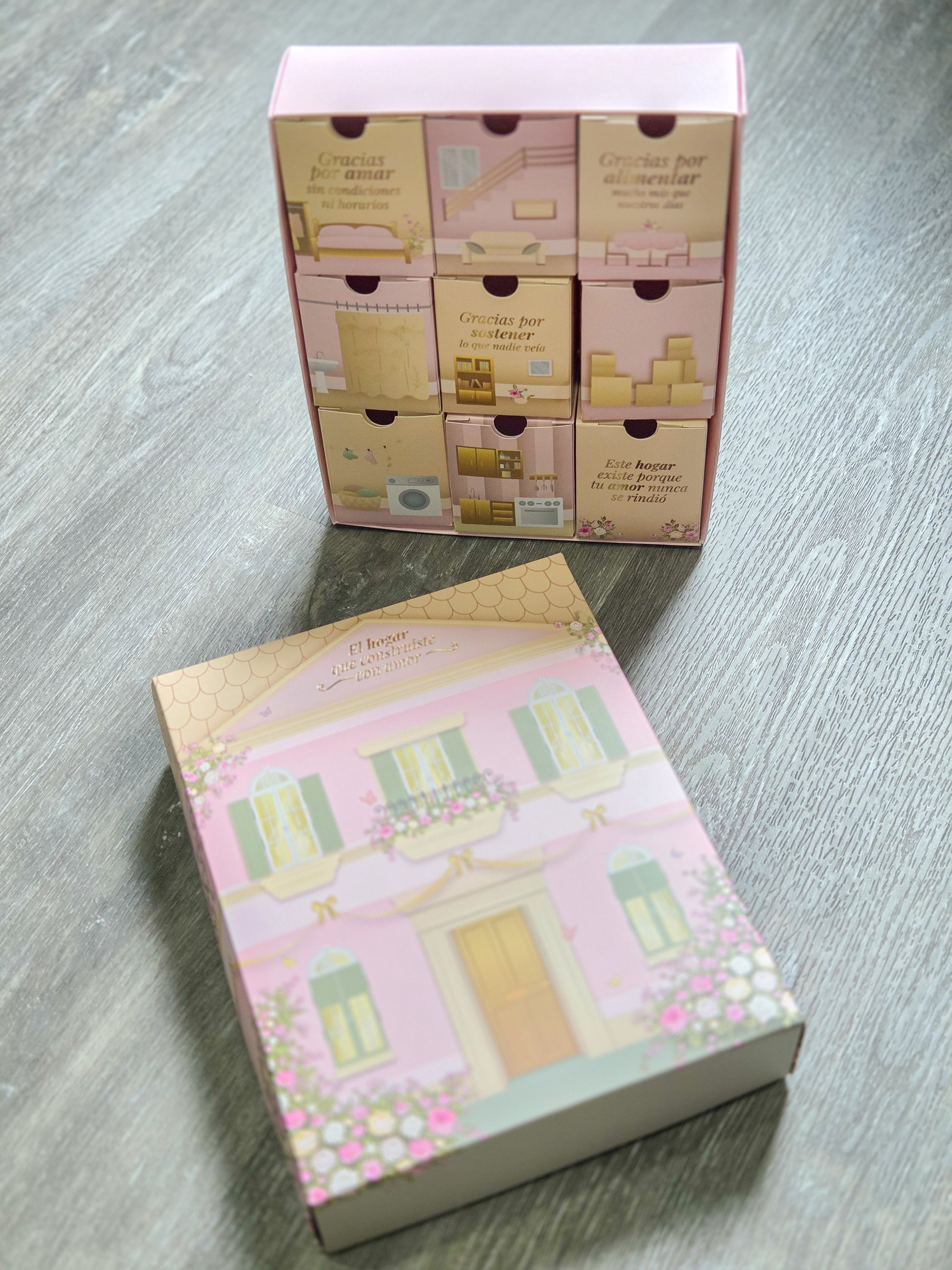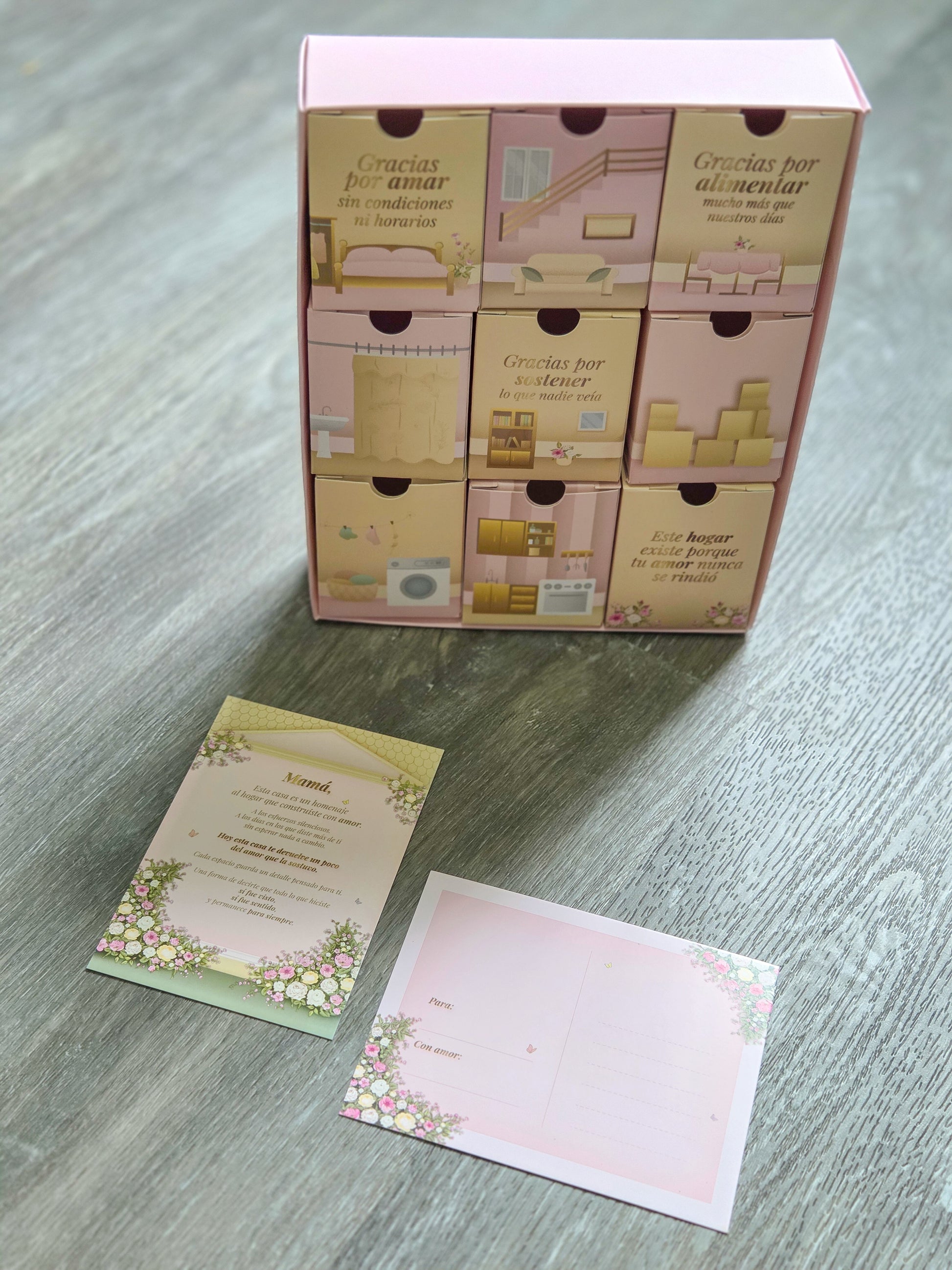- Caja viene acompañada de una tarjeta hermosa para dedicarle el mensaje a mamá y en otra para que le puedas escribir cuan grande es tu amor y cuan bendecida eres de que sea tu mamita