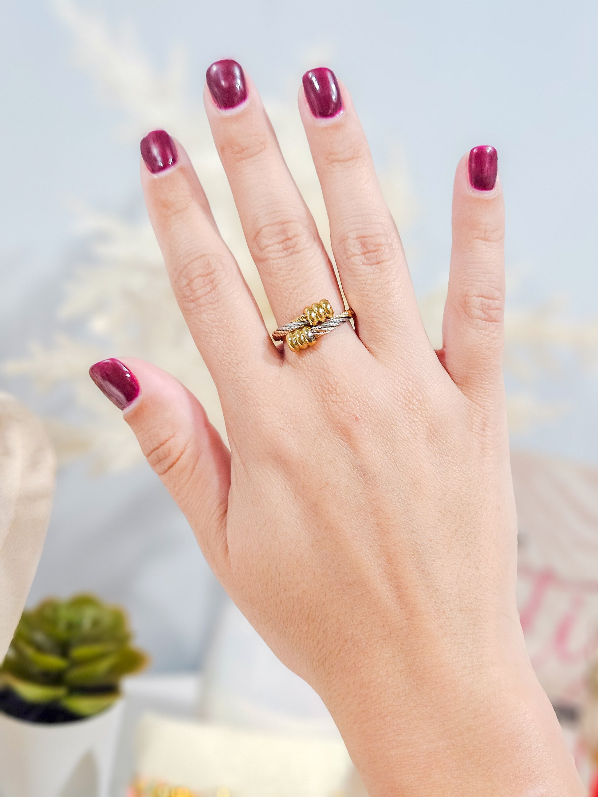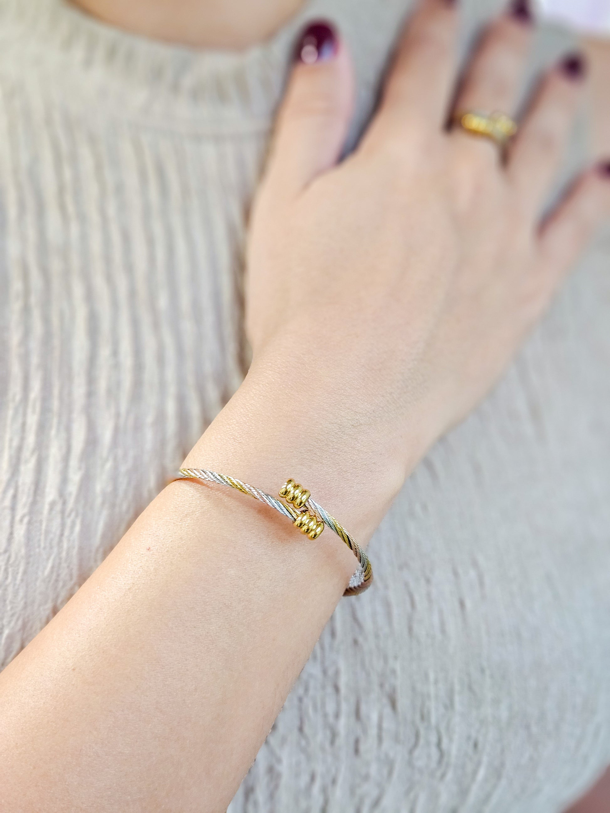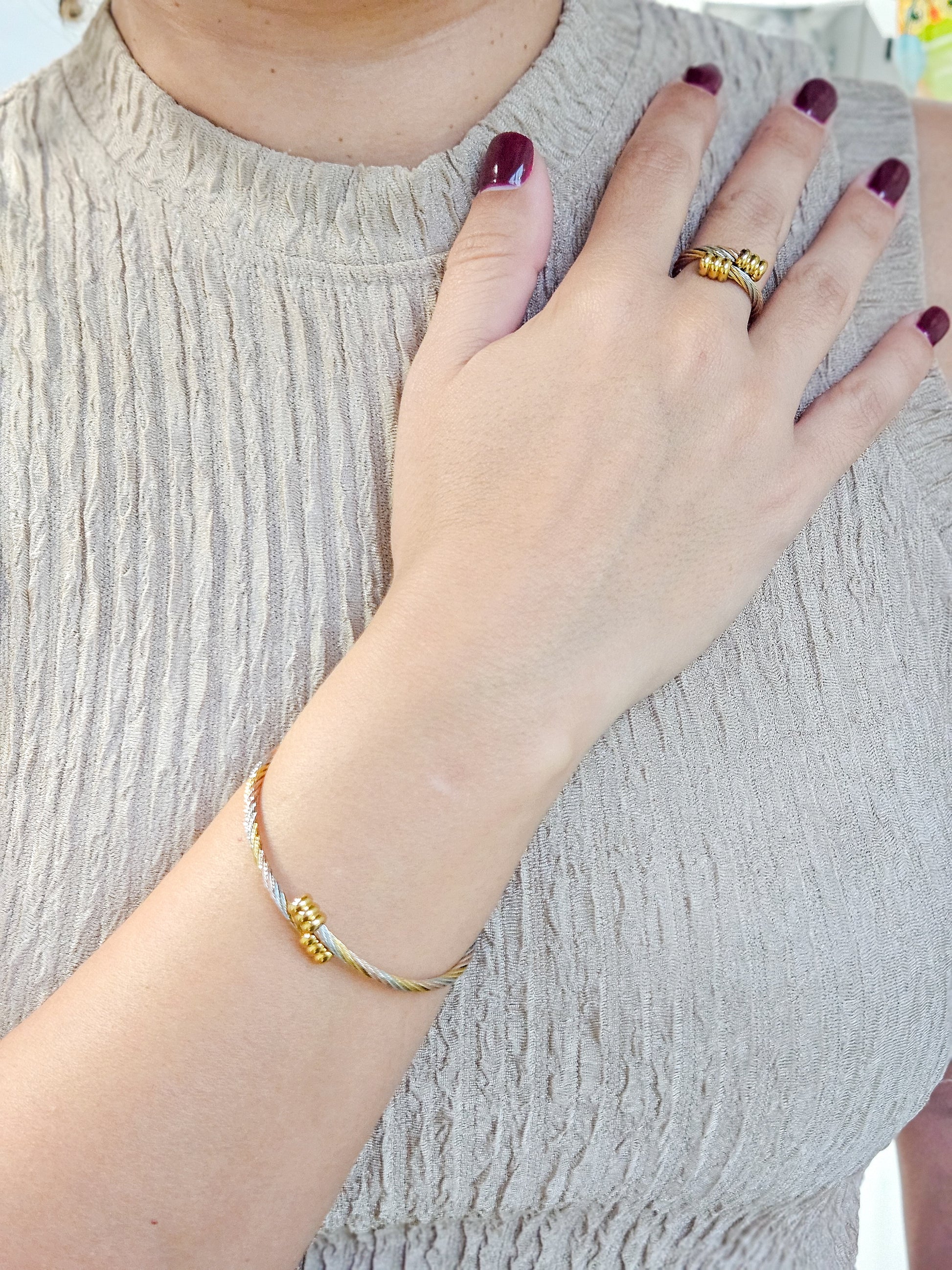 - Set de sortija y open bangle tre tonos: plata, oro y rose gold