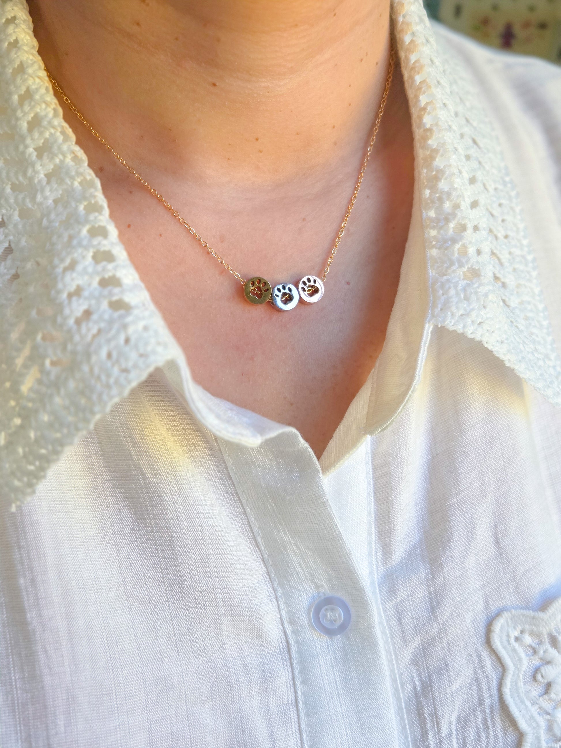 - Cadena tiene huellitas de perrito en color oro, rose gold y plata